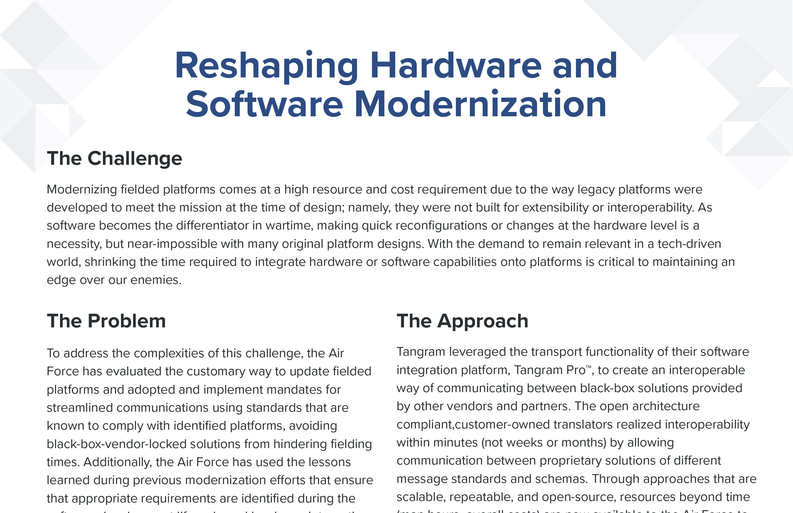 Our team of talented engineers work with you to utilize the power of Tangram Pro™ to tackle your software integration and interoperability challenges.